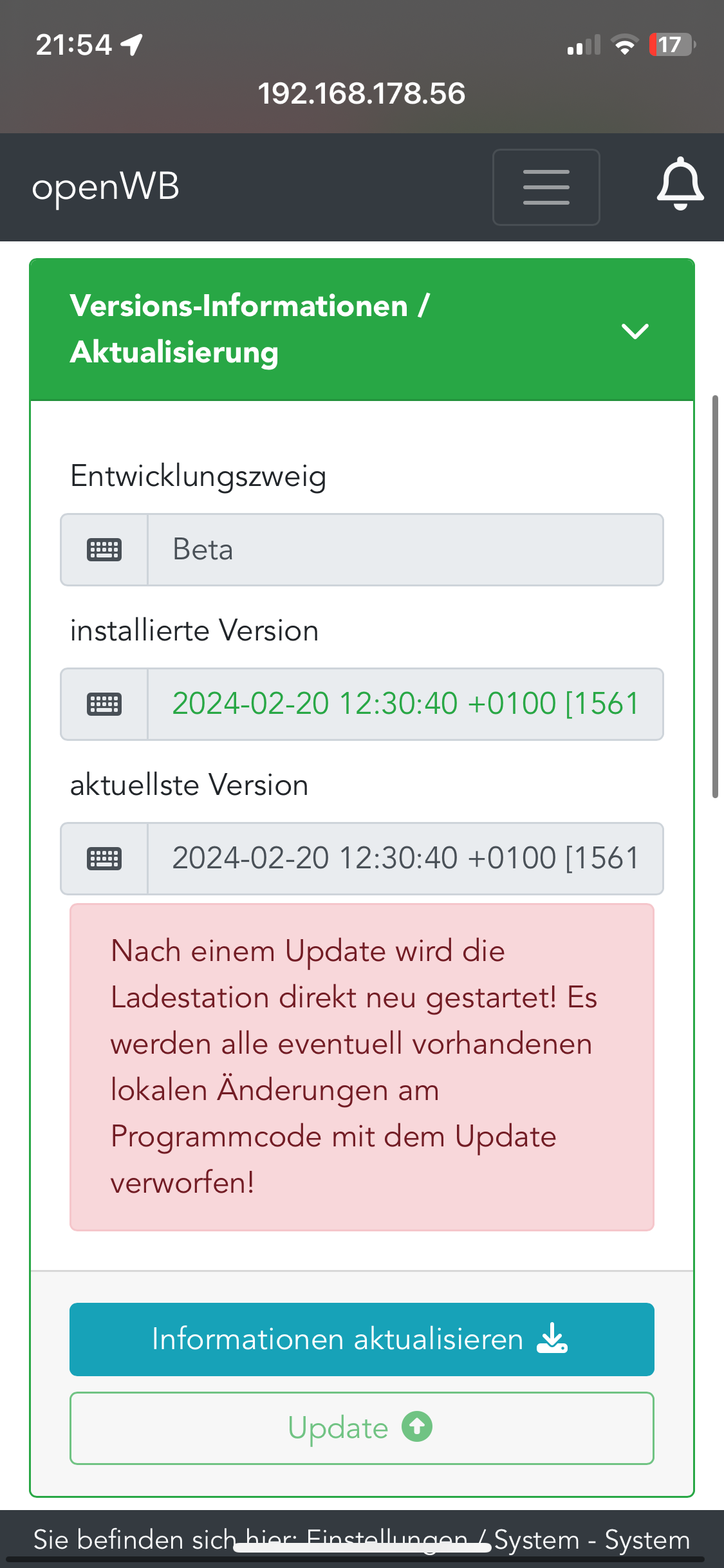 Vielleicht liegt es auch lokal an einer (zerschossenen?) Konfiguration, dann würde ich die OpenWB evtl. bald mal resetten und alles from scratch neu einstellen - auch wenn das echt viel Arbeit ist. Restore von einem Backup hat jedenfalls nichts gebracht.