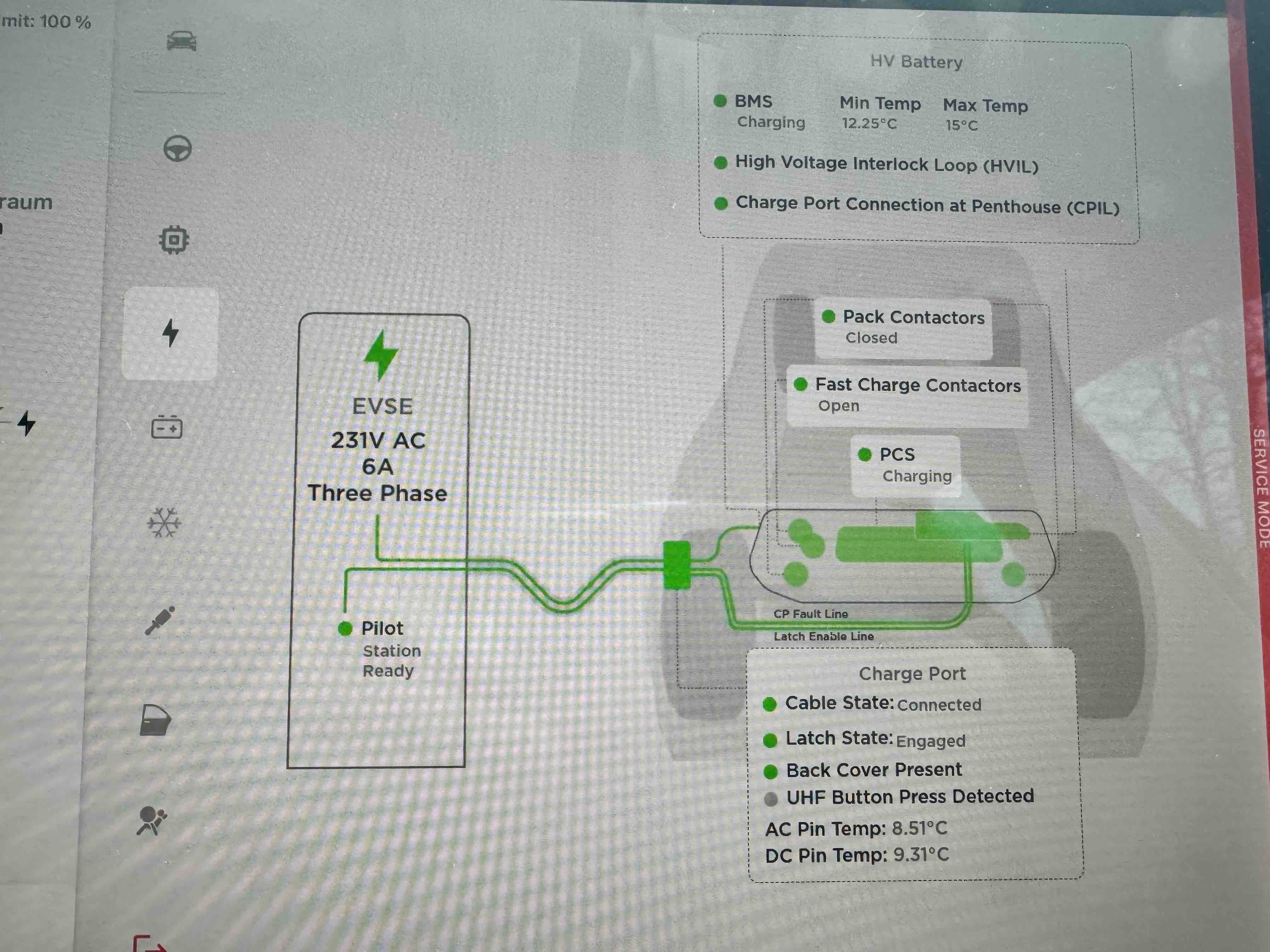 Coole Idee, in den Service Mode zu gehen. Bei mir ist's anfangs grau, weil schon seit Tagen kein Strom vom Dach kommt, beim Umschalten auf Sofortladen wird's grün, und gelb wenn's nur eingesteckt ist, aber kein Strom angeboten wird. Rot habe ich nicht.