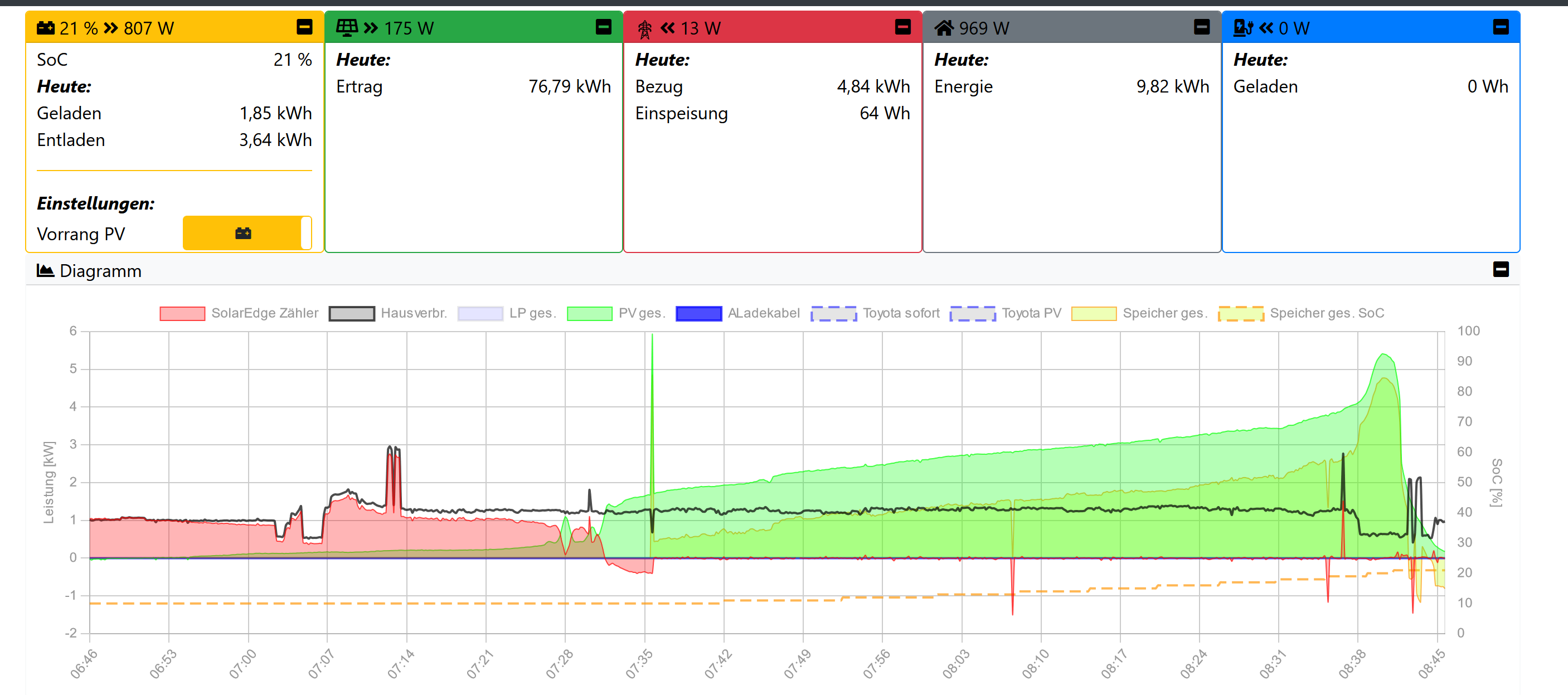 Die falsch angezeigten Werte sind: PV Leistung - jetzt aktuell 585 Watt (es ist schon Dunkel), Netzimport 0 Watt, Hausverbrauch viel zu hoch mit 811 Watt - es sieht so aus als würde die openWB die Werte von der Batterie und von der PV addieren und als Hausverbrauch ausgeben.