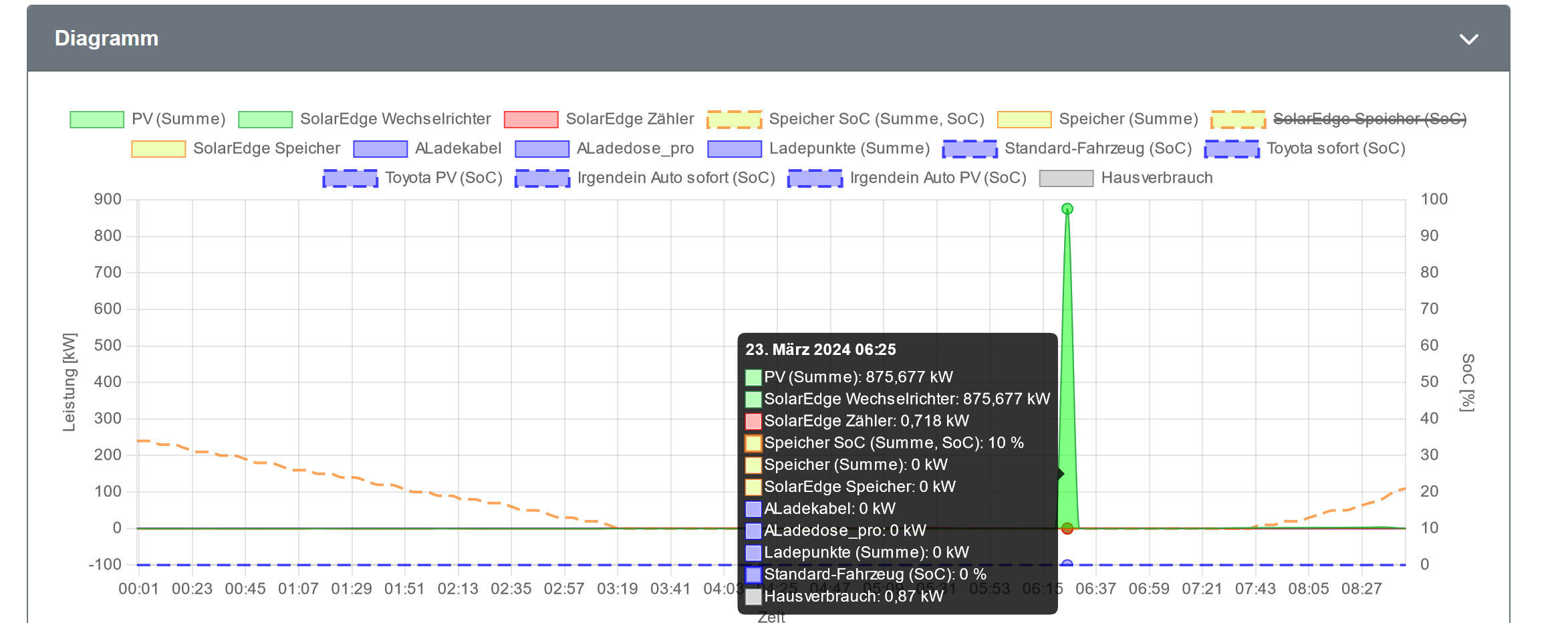 ich habe eben bei mir nachgeschaut, da ist alles ok. openWB sagt einen Ertrag von 2,19kWh und die SolarEdge App sagt 2,27kWh. Also nur eine geringe Abweichung. Einen Peak im Diagramm konnte ich nicht feststellen.
