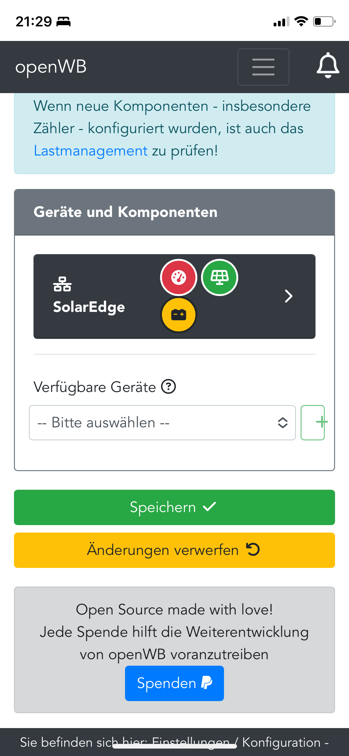 Ich gehe auf "Konfiguration" --> "Geräte und Komponenten" --> "Verfügbare Geräte" --> "Solar Edge" --> "+"