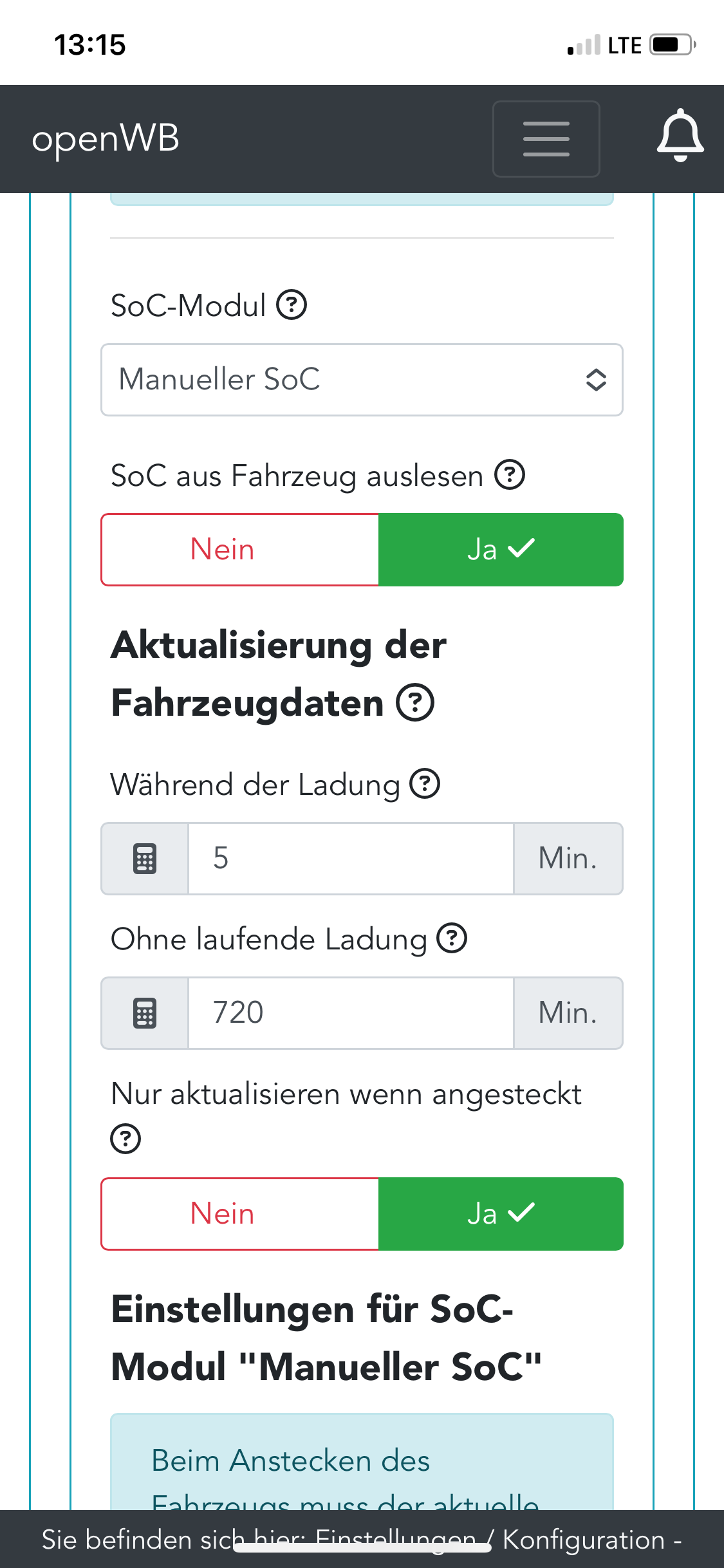 Als SoC-Modul habe ich "Manuell" ausgewählt und die Fahrzeugauslesung an: