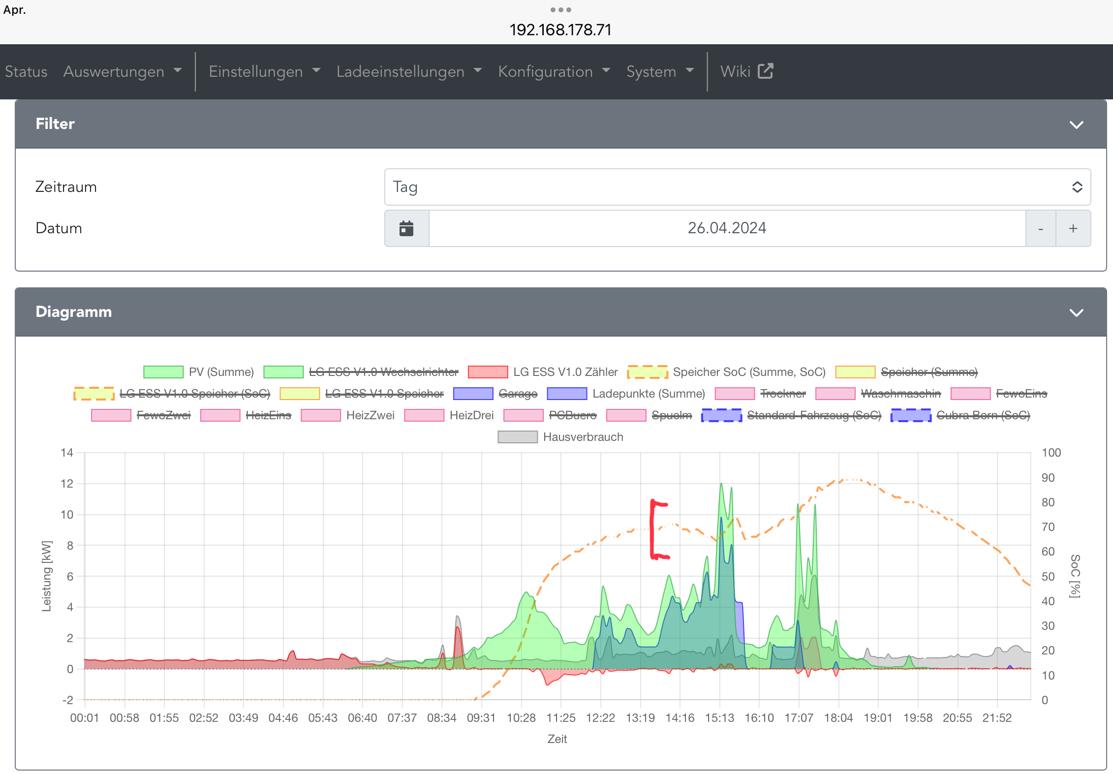 Das ist genau auf der 4kW-Grenze und der Tatsache geschuldet, dass ein paar Minuten bis zur Phasenumschaltung auf eine Phase vergehen mussten. Selbiges hast du später dann mit der Abschaltschwelle. Wenn du die aber zu knapp setzt, unterbricht die Wolke die Ladung.