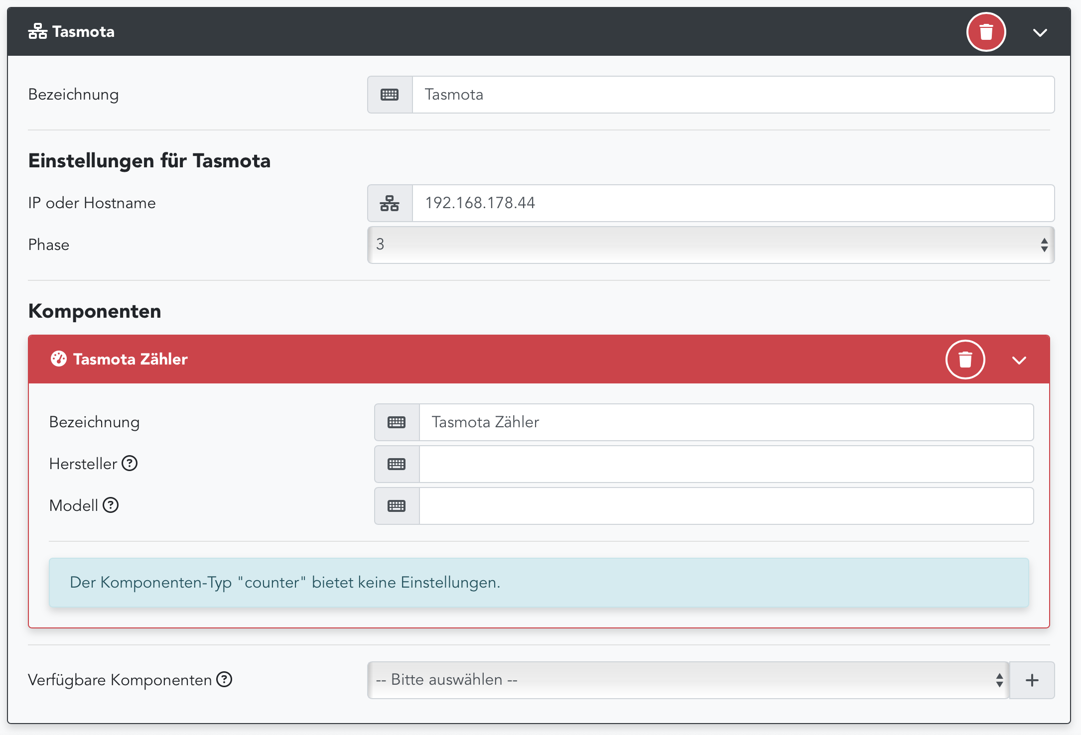 Als Gerät "Tasmota" auswählen, IP-Adresse und Phase angeben, als Komponente "Tasmota-Zähler" dazu, fertig.