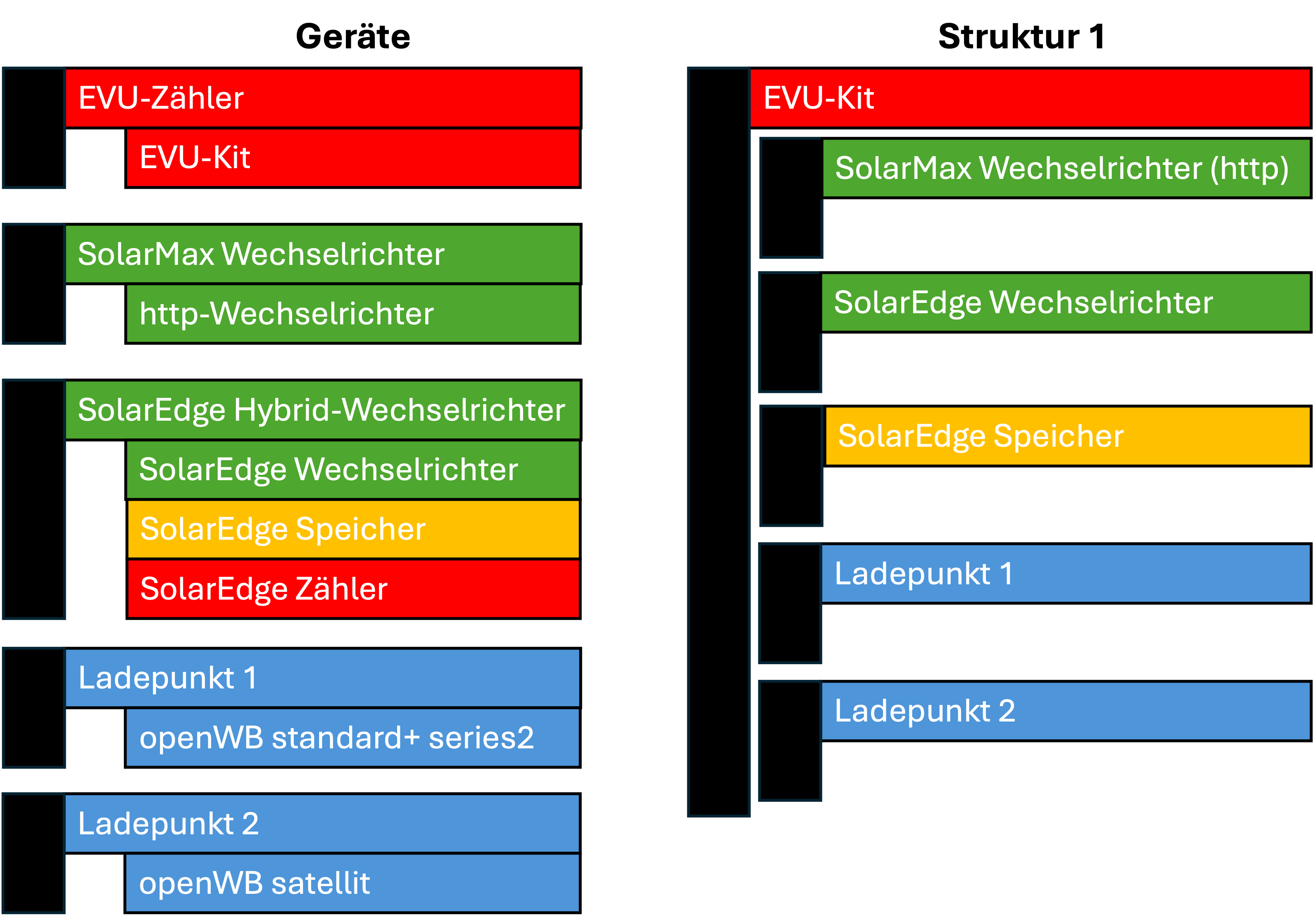 Die Installation steht nun kurz bevor, so dass ich beginne, die Umstellung auf die Software-Version 2 vorzubereiten. Da mir nicht ganz klar ist, wie ich mein Geräte-Durcheinander aus verschiedenen Jahren am besten abbilde, habe ich versucht, das in den Anhängen darzustellen. Wichtig wäre mir, dass natürlich das Lastmanagement optimal funktioniert, aber auch der Hausverbrauch sollte passen.