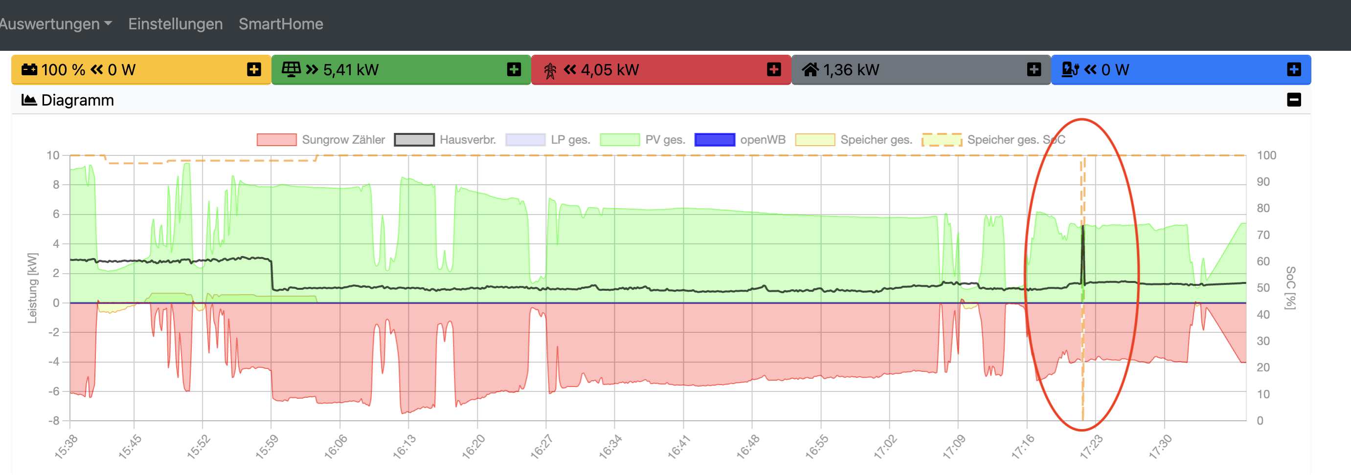 bei mir fällt der SOC ges. des Sungrow Speichers auf 0 um dann wieder den tatsächlichen wert anzuzeigen. Gleichzeitig schiesst in dem Moment der Hsuverbrauch nach oben (ohn dass ein Verbraucher zugeschaltet wird) . Liefert der Speicher keinen Wert oder ist es ein Netzwerkthema?