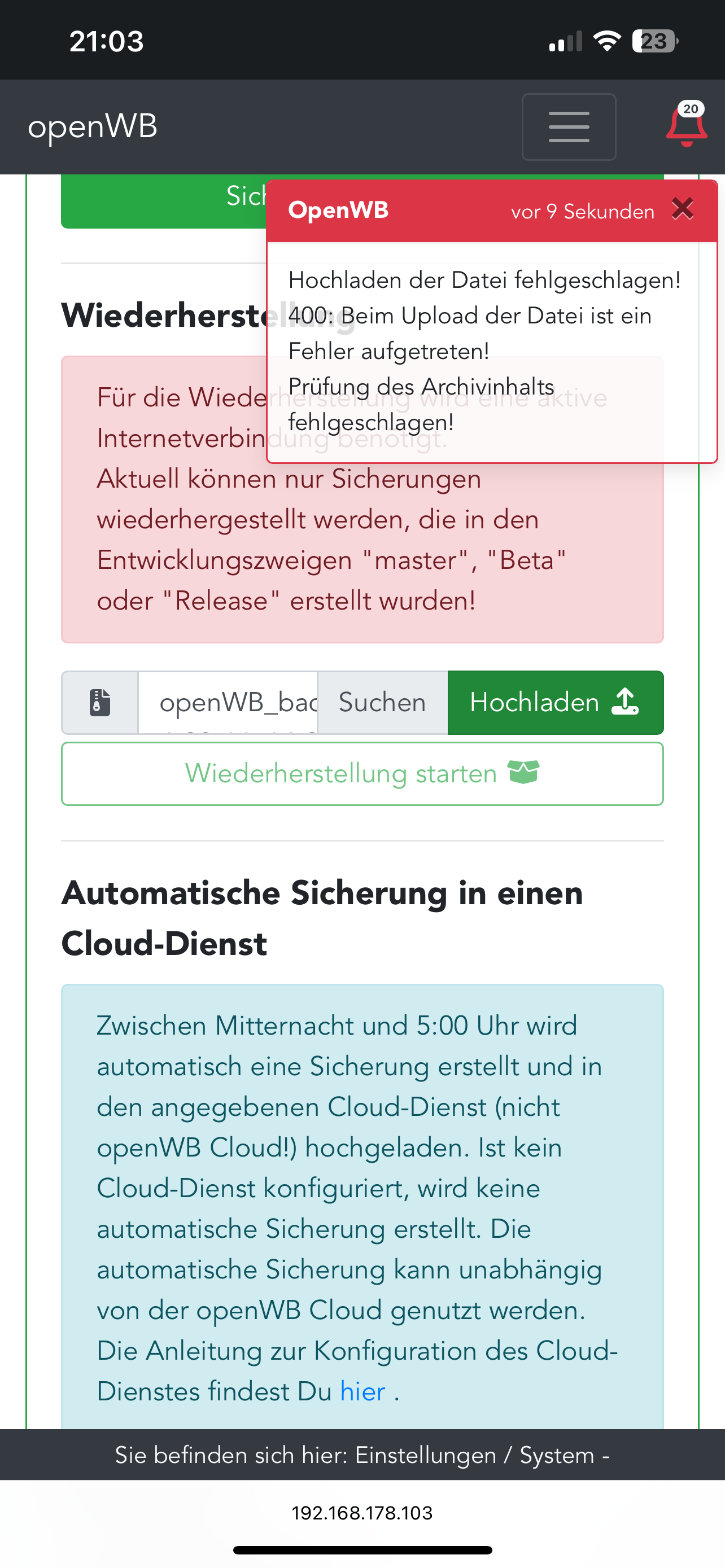 2) Daten aus dem SW1.9 Backup konnte ich nicht laden. Es erscheint der Fehler „400: beim Upload der Datei ist ein Fehler aufgetreten! Prüfung des Archivinhalts fehlgeschlagen“