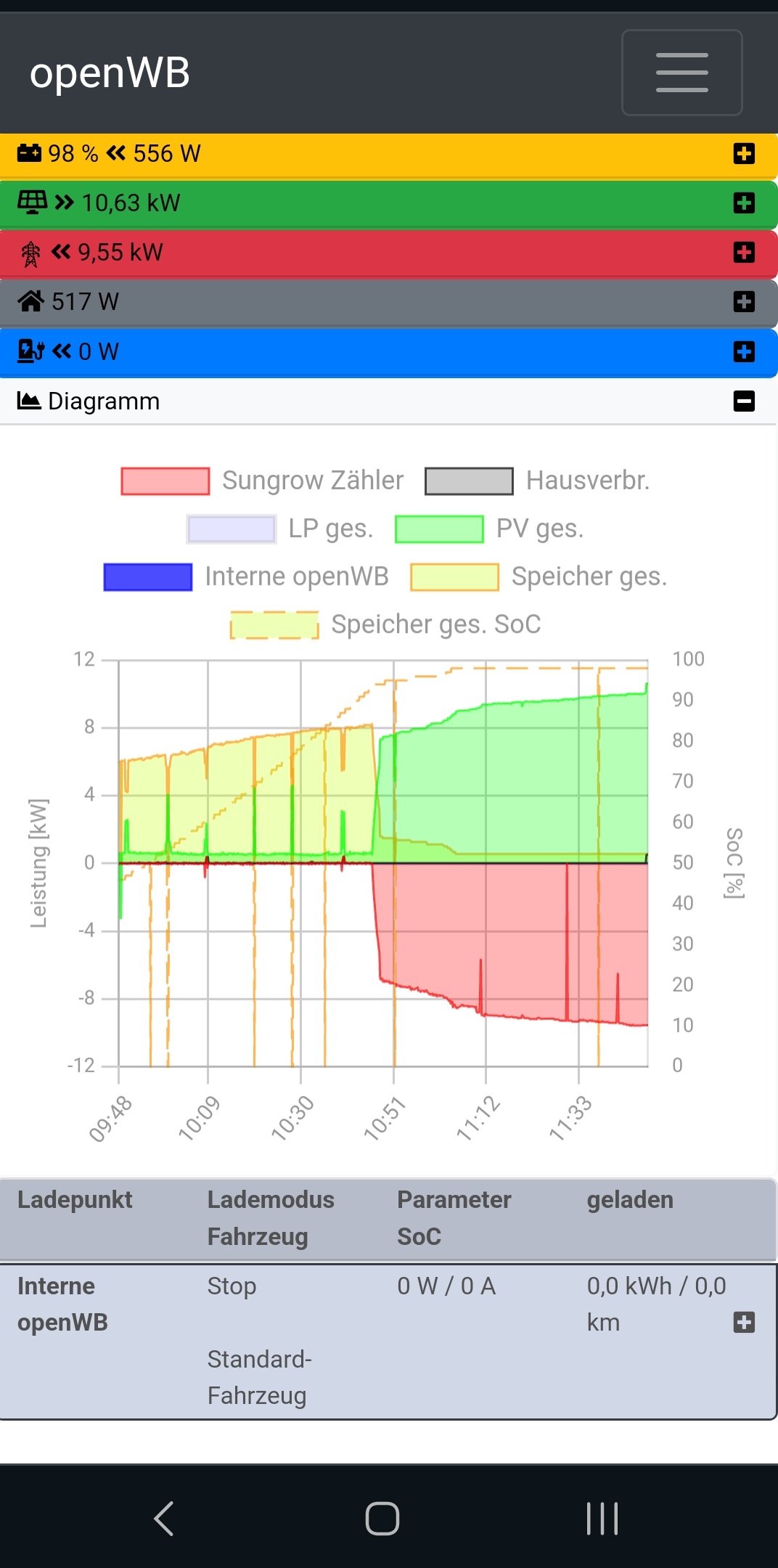 1) Openwb Interpretiert den Wert Ladeleistung Batterie genau so wie Entladeleistung Batterie: Er geht immer davon aus, dass der Speicher geladen wird, wenn der Wert nicht = 0. Wird der Speicher also Entladen, glaubt ObenWB der Speicher wird geladen.