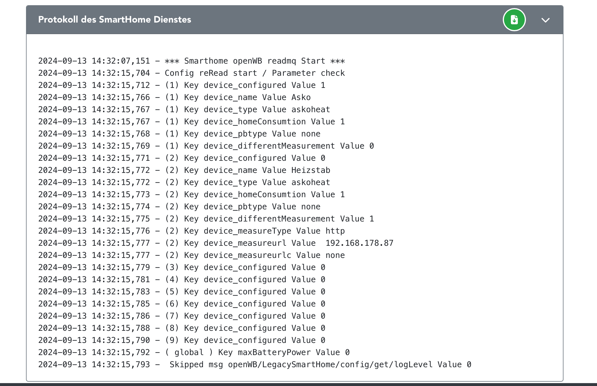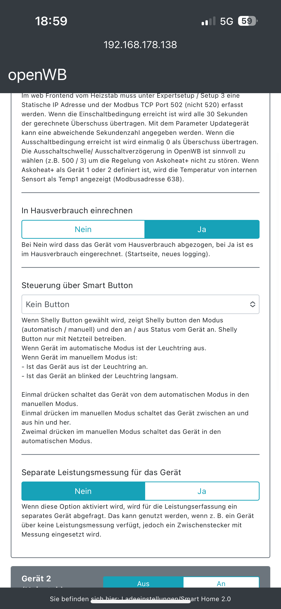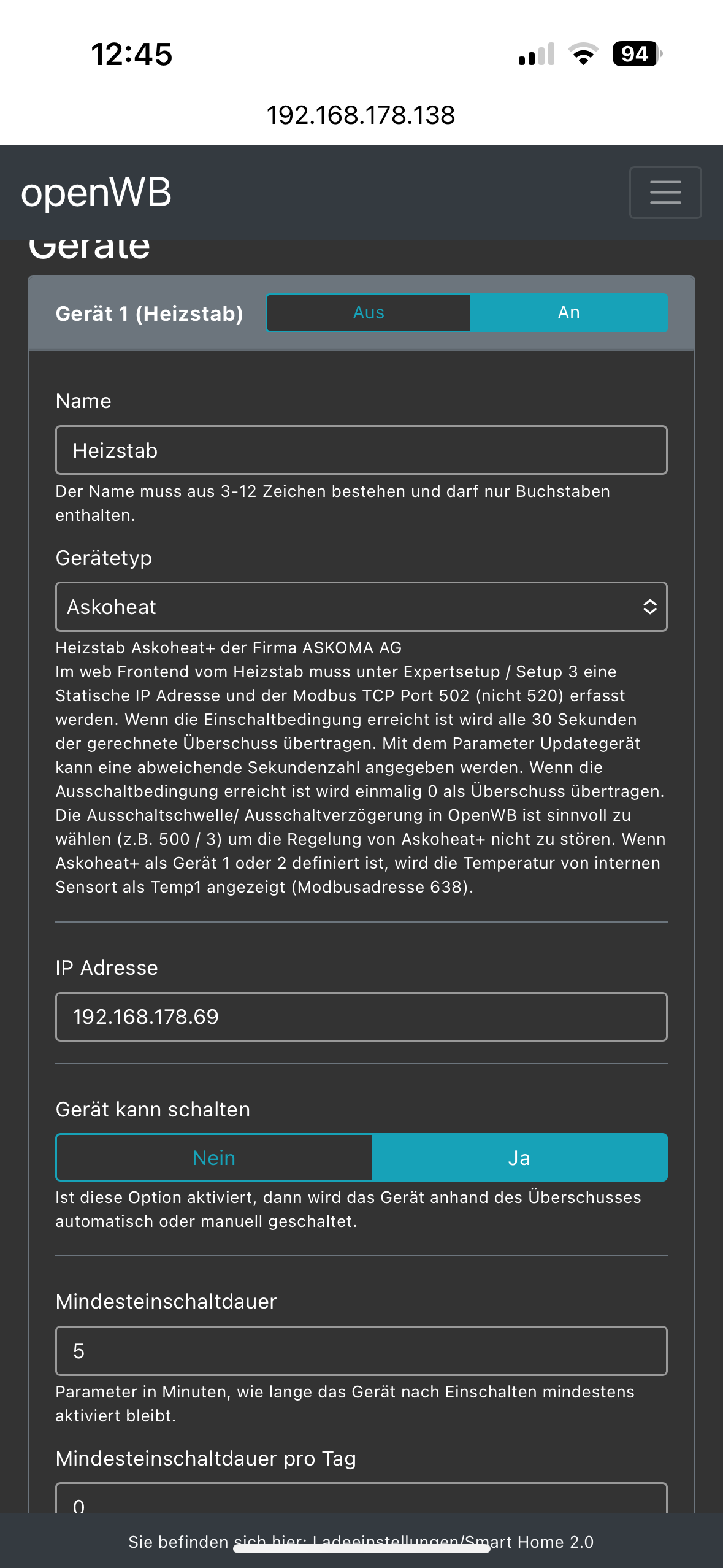 Ich weiß nicht mehr weiter und bin einmal mehr auf eure Hilfe angewiesen. Ich habe eine neue SD Karte mit der 2 er Softwareversion installiert und habe soweit alles eingerichtet. Meine RCT Komponenten (PV, Wechselrichter, Speicher) funktioneren. Der LAdepunkt und das Autoladen klappt auch. Nur bekommen ich den Heizstab (Askoheat) nicht ans laufen. Unter der 1.9 er hatte ich viel mehr Möglichkeiten um den Heizstab einzustellen. Ich konnte die IP eingeben und die Schaltstufen. Dies ist unter der 2 er Software alles nicht möglich. Ich weiß einfach nicht mehr weiter was ich falsch mache. Das Ding springt einfach nicht an. Anbei einmal ein paar Bilder meiner Einstellung.