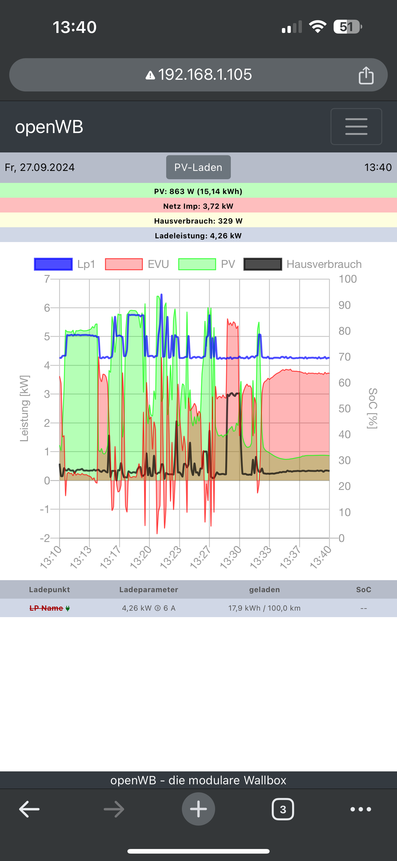 https://openwb.de/main/?page_id=1104BenSpandau hat geschrieben: Sa Sep 28, 2024 3:15 pm Okay, wie ich mir dachte, gab es aufgrund des Screenshots ein paar Missverständnisse. Beim Screenshot steht PV Laden, die Einstellungen wurden aber kurz vorher gewechselt. Somit wurde der Screenshot in der Einstellung PV plus Min gemacht. Was kann ich in den Einstellungen verändern, damit die Ladekurve sich schneller dem Ertrag der Sonne anpasst? Also fast übereinander liegt?