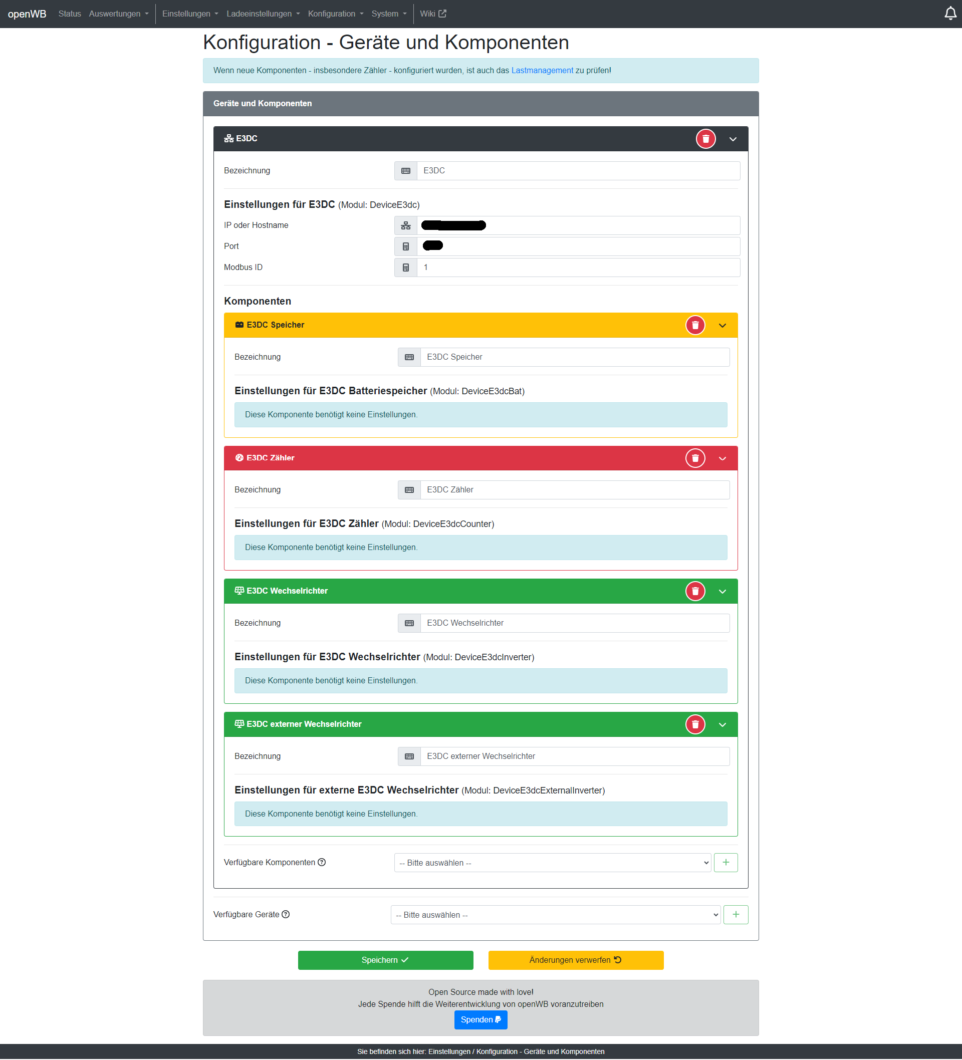 Dann ist das technisch gesehen "ungünstig" angeschlossen worden. openWB erwartet an oberster Stelle genau einen Zähler. Wenn das absicht ist, die WB parallel zu dem restliche Hausnetz und vor dem Messpunkt des Speichers zu betreiben (verstehe den Sinn nicht wirklich), dann musst Du mit einem virtuellen Zähler arbeiten, in dem dann der Ladepunkt und Dein E3DC Zähler sitzen.dawys hat geschrieben: Mo Sep 30, 2024 4:14 pm technisch gesehen ist die Wallbox neben dem Zähler und nicht hinter dem Zähler. Aber ich habe dies auch schon verändert, wie von dir vorgeschlagen und es brachte leider keinen Erfolg.