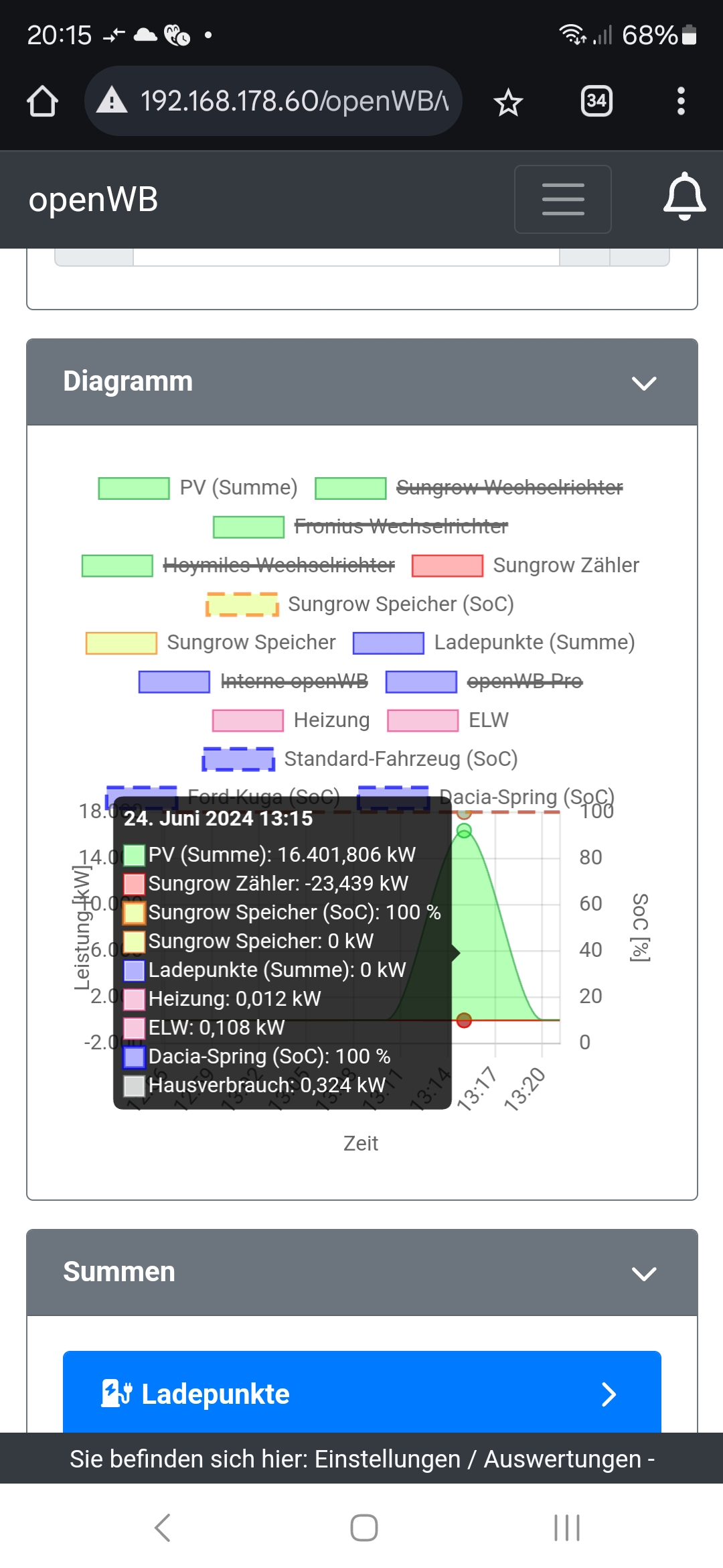 Ich habe gerade die Monatslogs der letzten Monate durchgeschaut und die letzte Spitze gefunden - es war am 24.Juni 2024 und es war nicht die Ladeleistung, sondern PV (Summe): 16.401,806 kWh - um 13:15...