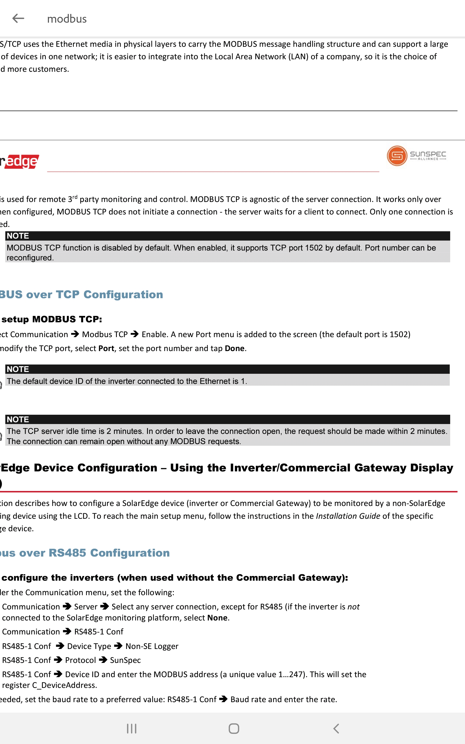 Hier ist der Ausschnitt aus dem Solaredge manual. Bei meinem solaredge Wr reicht es ihn stromlos zu mschen, 30 Sekunden warten und wieder einschalten. Openwb versucht ja zyklisch unter der ipadresse die du in den Parametrisierung angegen hast der Wr über Modbus zu erreichen.Woodstock71 hat geschrieben: Mi Apr 08, 2020 6:04 pm