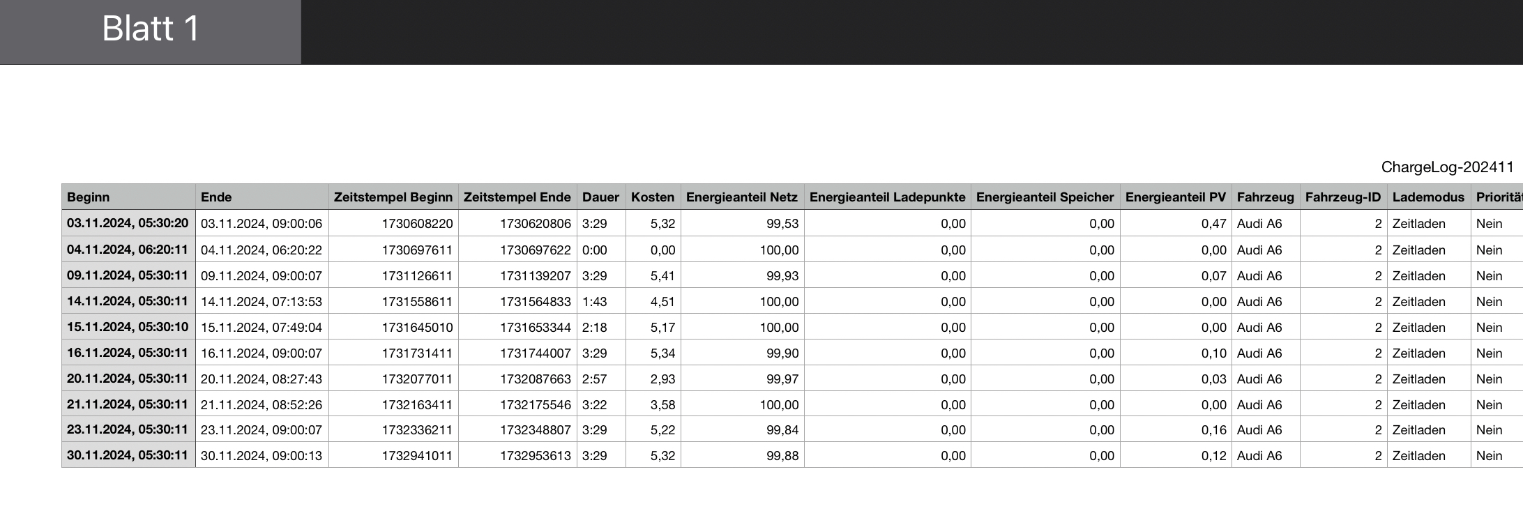 Im Ladeprotokoll vom November ist alles korrekt. Es gibt keinen PV-Anteil, da zu den Ladezeiten im November auch keine Sonne scheint.