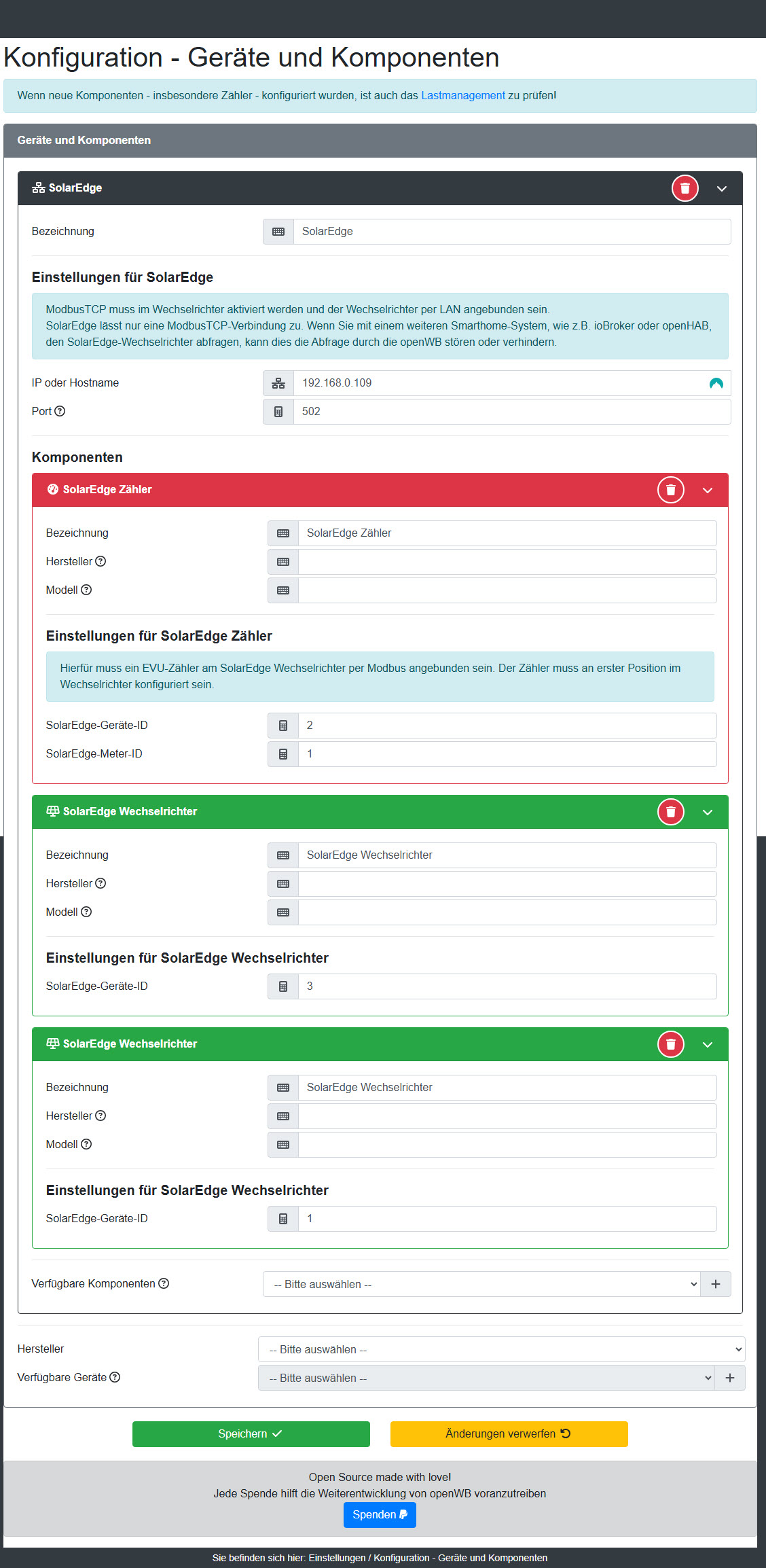 Ich betreibe die openWB seit mehreren Jahren mit einem Solaredge-Zähler und zwei Solaredge-Wechselrichtern, die über Modbus verbunden sind. Bei der Umstellung auf 2.0 wird der Zähler nicht erkannt. Unter SW 1.9 läuft das ganze mit folgenden Einstellungen: