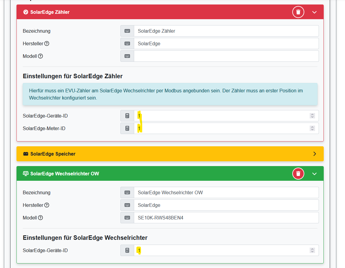 In der OpenWB wird der erste Speicher aber nur erkannt wenn "SolarEdge-Geräte-ID = 1" verwendet wird.