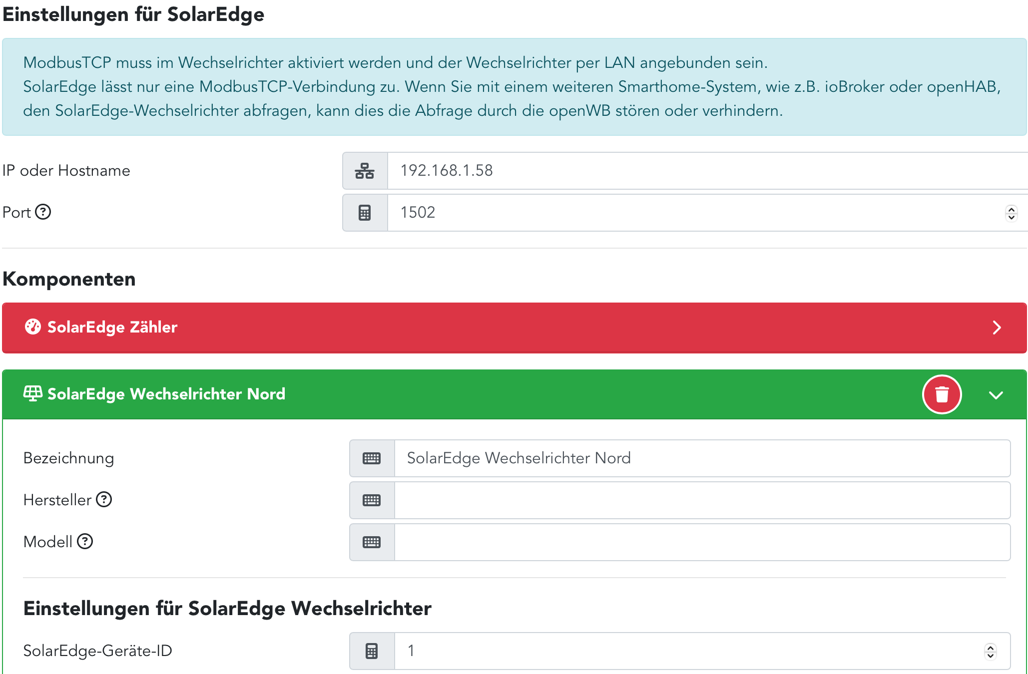 Nun ist ein SE5000 hinzugekommen. Ich habe versucht, ihn als zusätzliche Komponente "SolarEdge-Wechselrichter" einzurichten und bei der SolarEdge-Geräte-ID eine "2" eingetragen. Das funktioniert aber nicht.