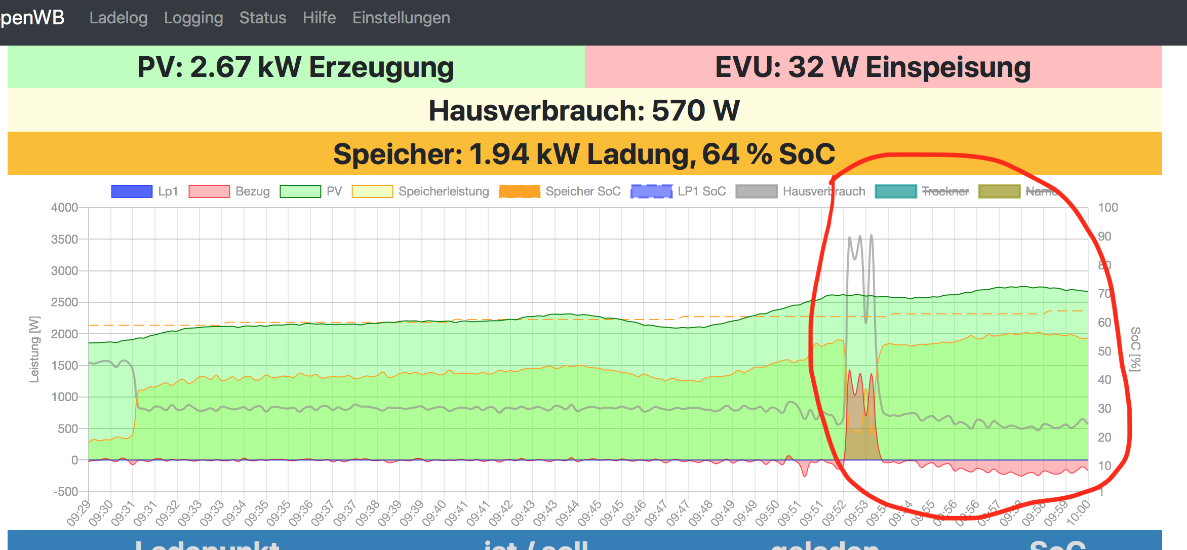 Um 6.25 ohne OV Betreb der Kaffeemaschine korret angezeigt, dann nach EInsatz der PV Leistung beginnt gegen 6.50 Uhr eine unplausible Anzeige (Graph+Werte in der Kopfzeile)